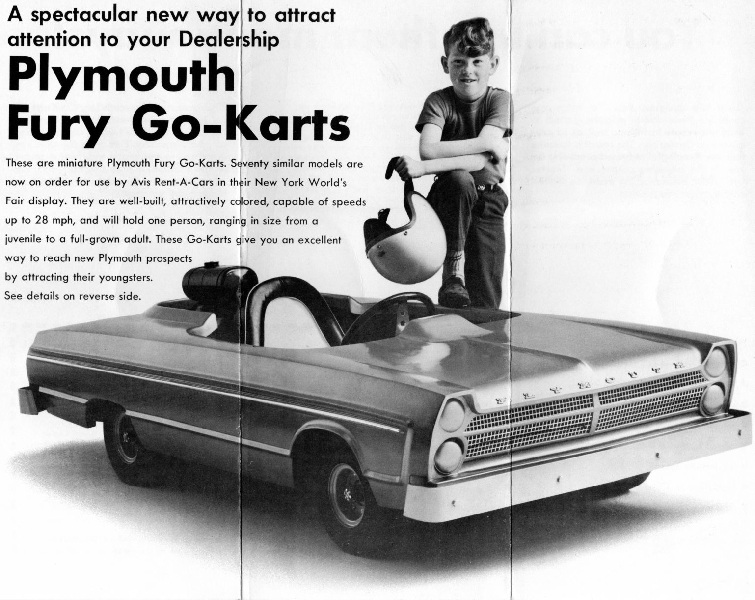 This particular version of powered promotional model was made by a company in Detroit called Creative Industries that most people are not familiar with. They were basically a job shop for Chrysler Corporation and many other manufacturers that did lots of custom one off jobs that were too small to tool up the plant to do from 1950-91. They made a number of Ford and Packard show cars and did the final assembly for the 1969 Dodge Daytona and 1970 Plymouth Superbird the big winged cars that were built for nascar racing. They had made fiberglass bodies for Dodge, packard and Ford show cars so doing the mini Plymouth would not have been difficult for them to do. The Primary customer for the project appears to be the Avis rental car company that purchased 70 of them for the new york worlds fair. Since they had fairly substantial front and rear bumpers I would verture to guess that the were used on a driving course where they were expected to run into each other on occassion. They would go as fast as 28MPH but could be governed back to a slower speed for younger drivers. They would also fit adults but no size limit is given. I have started a Resources page that I will list known available original parts and reproduction parts for Powercar products. But the list is only as good as the information that I am provided. or as good as i am able to update it. if you have information to share or parts to sell let me know. Looking for Powercar parts? Go to the Powercar resources page |