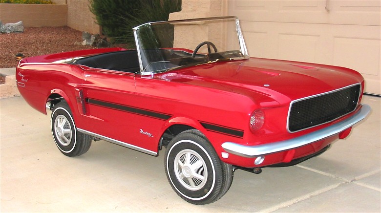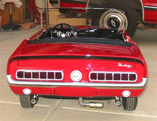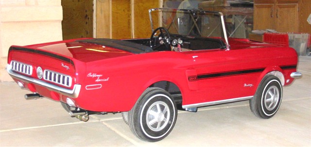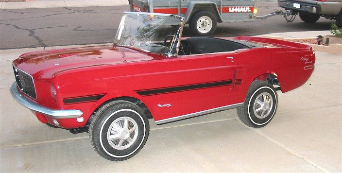What happens when you own a full size 1968 Califonia special and you want a Junior version? Since the Powercar company went under in 1967 they obviously did not make a 68 version! And they never made any special editions such as a Shelby or California Special nor a High country edition! When you enlist the help of D and S Pedalcar that is not a problem! They took an original Mustang Jr and heavily modifed it! The background of Picture number 6 shows the begining of the process! click on the small image to see the full size image and you will see the trunk lid area has been removed to replicate the special trunk lid with spoiler used on the real cars (also fiberglass) and this also makes for easy access to the motor. The original taillight housings have been replaced with the Carol Shelby style taillights that were used on CA Specials. You can also see the beginning of the side scoops. I have started a Resourses page that I will list known available original parts and reproduction parts for Powercar products. I have also started to compile a list of surviving cars. but the list is only as good as the information that I am provided. or as good as i am able to update it. if you have information to share or parts to sell let me know. |