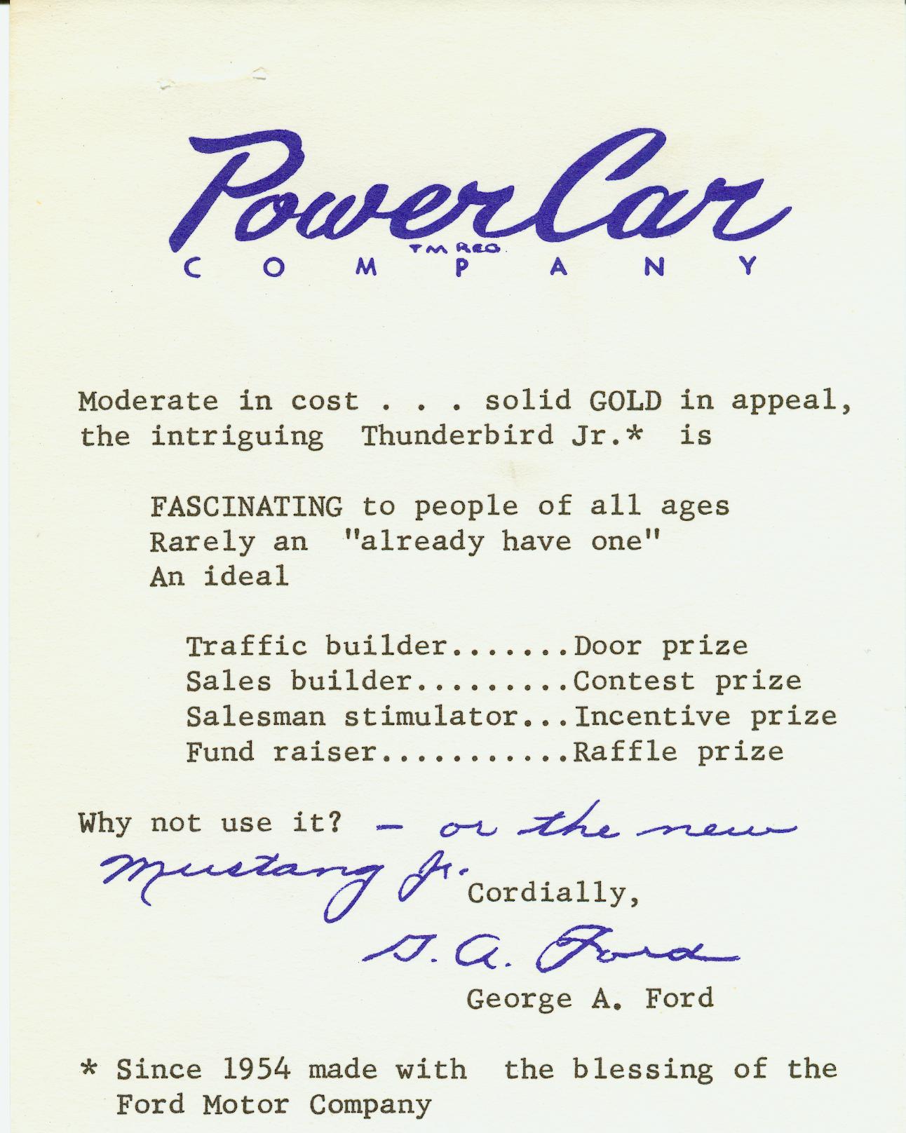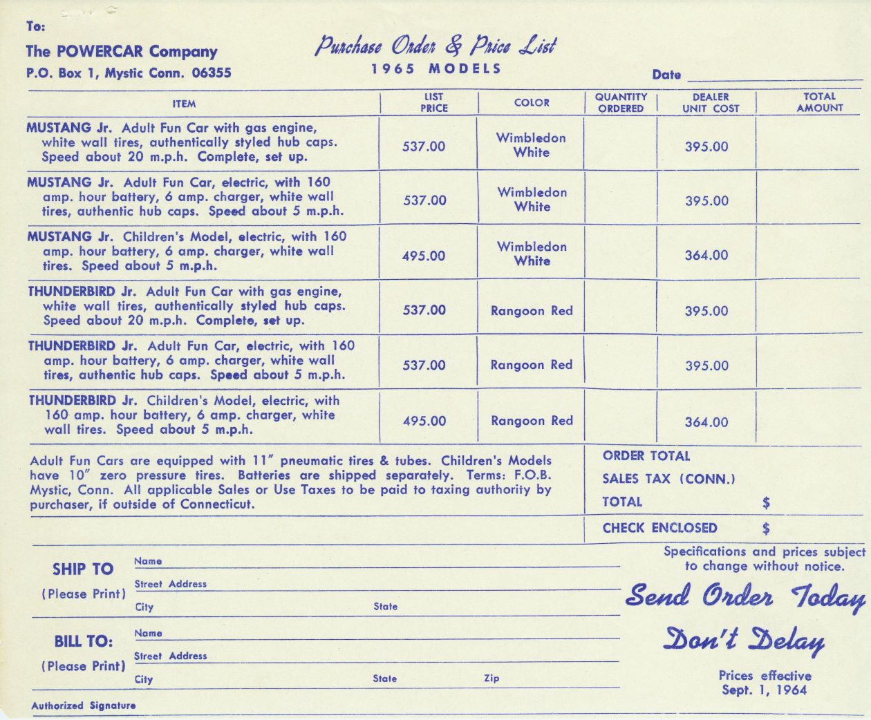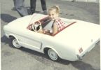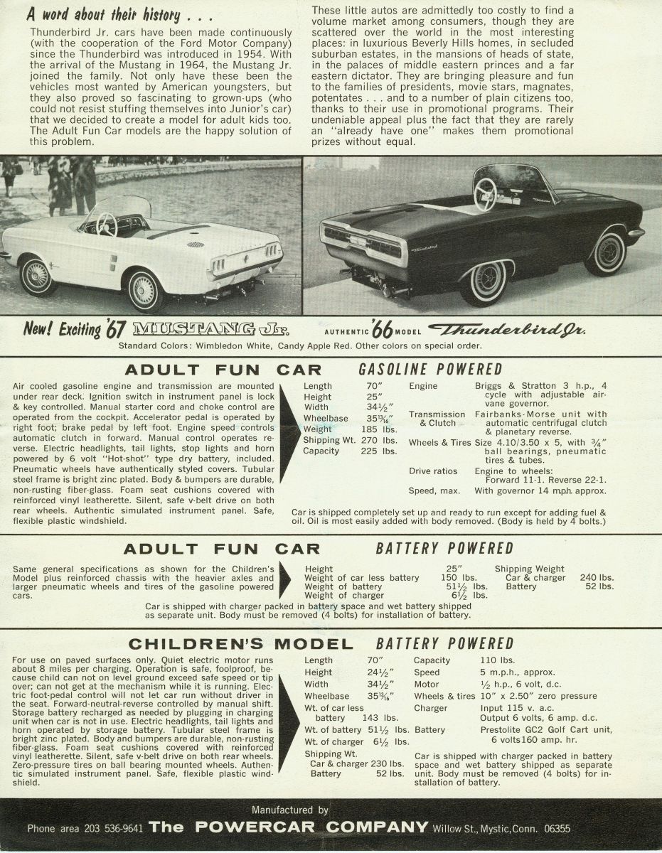 After making Thunderbird Juniors since 1954 when the first 1955 Thunderbird was introduced it was only natural that they started making the Mustang Juniors in 1964 in conjunction with the introduction of the new Ford series and continued with styling changes through 1967 just like the full size cars when the Powercar company went under. Not a cheap toy!here are the costs from the 1965 sales price sheet effective Sept. 1, 1964 1965 kids retail $495.00 dealer cost $364.00 1965 adult retail $537.00 dealer cost $395.00 (yes electric and gas versions cost the same) The 67 Gas powered Mustang Junior I used to own was originally purchased by a shriner for use in parades, it carries some unusual options like faux rear view mirrors and a shriner special factory installed "frame handles" that attached to the frame so the cars could be loaded and unloaded without damaging the bodies. In order to restore my car I had to make a number of parts that could not be found. I have kept the molds and will be able to provide replacement parts for other mustang owners. (some parts fit thunderbirds also!) go to the resouces page to find the list. the statment they used on the 1967 brochures says it best!"Thunderbird Jr. cars have been made continuously since 1954 (with the cooperation of the ford motor company) with the arrival of the Mustang in 1964, the Mustang Jr. joined the family. not only have these been the vehicles most wanted by american youngsters, but they also proved so fascinating to grown-ups (who could not resist stuffing themselves into Junior's car) that we decided to create a model for adult kids too. The adult fun car models are the happy solution of this problem. These little autos are admittedly too costly to find a volume market among comsumers, though they are scattered over the globe in the most interesting places: in luxurious Beverly Hills homes,in secluded suburban estates, in mansions of heads of state, in the palaces of middle eastern princes and a far eastern dictator. they are bringing pleasure and fun to the families of presidents, movie stars, magnates, potentates... and to a number of ordinary citizens too, thanks to thier use in promotional programs. thier undeniable appeal plus the fact they are rarely an "already have one" makes them a promotional prize without equal." end quote