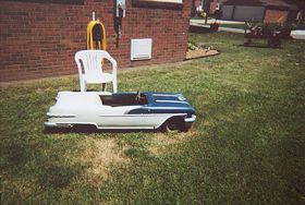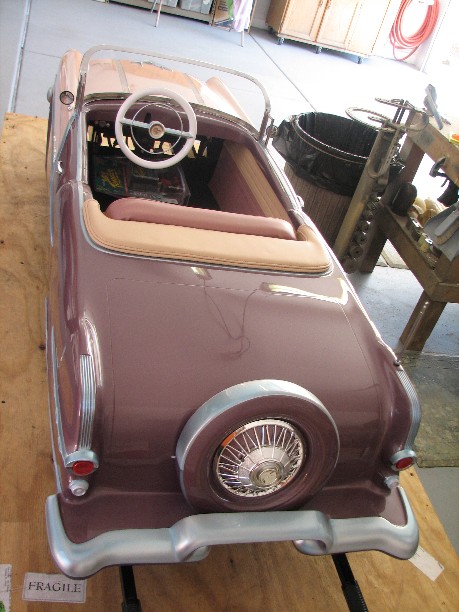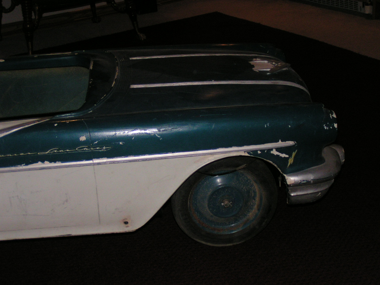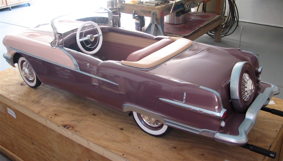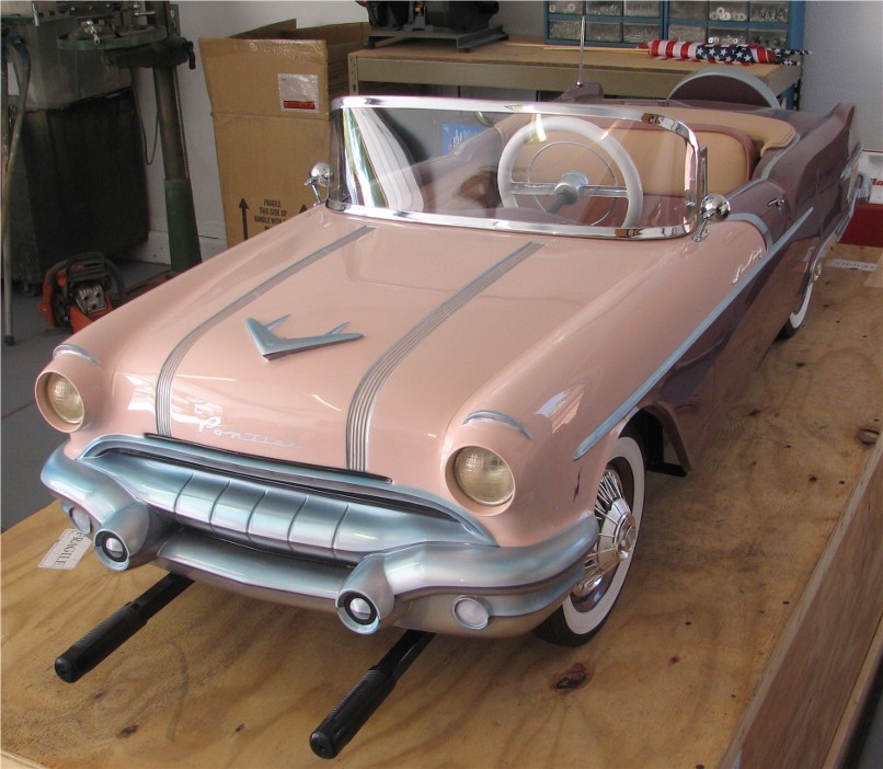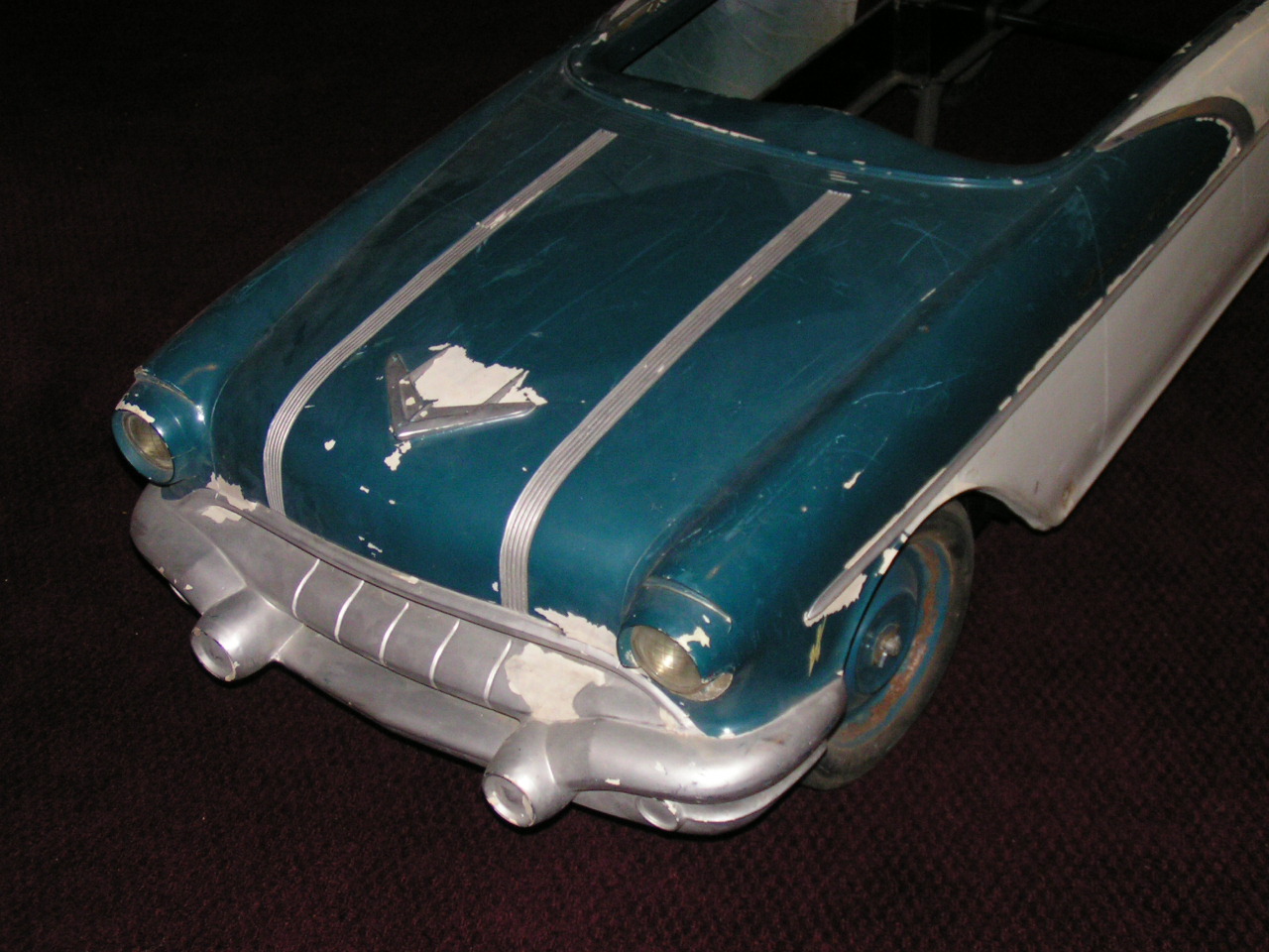 Silvestri Art studios of 1147 West Ohio Street in Chicago Illinois took on the challenge to make a junior car for the Pontiac division of General Motors in 56. The cars were 6 foot long. had working headlights and horn. operated on a standard car battery like many other JR cars. Thier fiberglass bodies were available in several colors, Semi Pneumatic tires with forward and reverse |