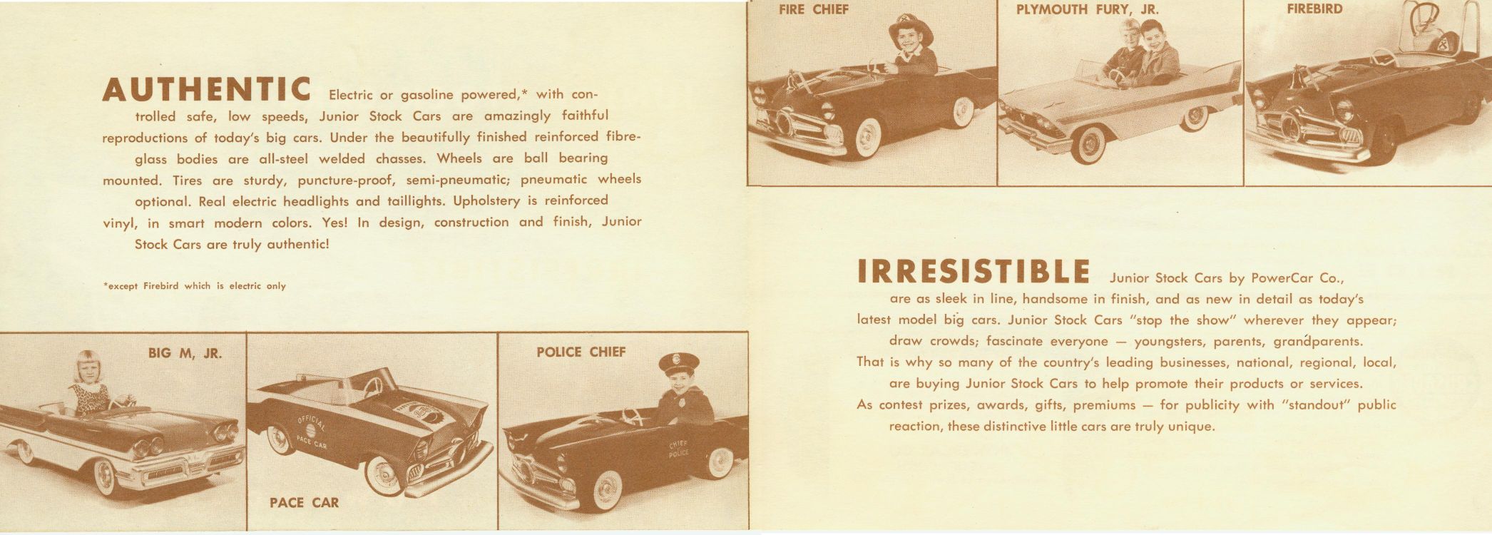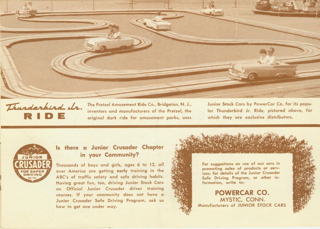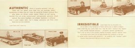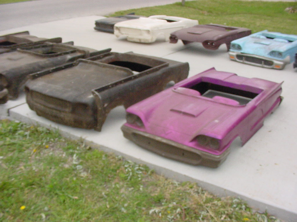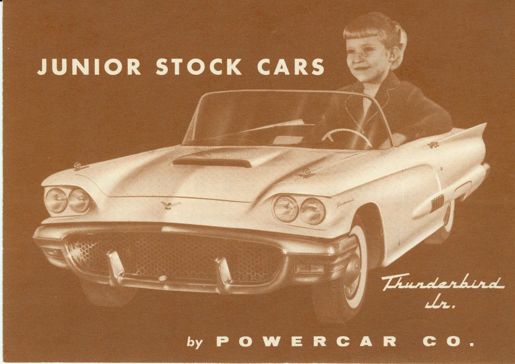 Just in case you came to this page directly from a search engine I have links to all of the other Powercar product pages from here. of course you can click on the Home page link at the bottom of this page to get to the home page. MoldsIn order to make the molds for these little cars and have them come out at the same time as the full size cars The Powercar company worked with the styling divisions of Chrysler and the Frod Motor Company. I have pictures of a Clay master for the 58 Fury Junior beind built and an article in the December 1958 Issue of Ford Times magazine. and there are a couple of original wood a clay mold masters still in exsistence. A group of shriners bought out much of the inventory of the Powercar company back in the 70s and over the years many of the original parts and molds were disposed of. I did manage to buy some of the molds off of the group and all of the original water transfer decals that they still had off. I am offering the water transfer decals and lots of other parts for sale on the resources page along with other parts that I reproduce. I have the following body molds in my possession. 1957 Thunderbird 58 Thunderbird (also makes 59 and 60 body) 65 Mustang (also makes the 66 body) and a 1967 Mustang Junior body mold that will also make the 1968 Body that was never made by Powercar since they went under in 1967. I often get people coming to my website looking for Mustang juniors for sale and Thunderbird juniors for sale. Obviously since they have not been made since the 60s you can not run down to Walmart and get one and since the originals were so expensive not many were made. Many were wrecked and tossed so the survivors are rare. With the availablity of replacement frames, bodies and many parts they can now be recreated. Go to the resources page to get more information LiteratureI have loaded the full line brochures on this page. Literature that is specific to a series (IE Thunderbird) will be on that specific page Powercar odditiesI have shown the Pace car, Firebird, Police chief's car and Fire Chief's car images on this page since they are based on a earlier thunderbird body with modifications. all of them are shown in the full line 1958 Brochure but the Firebird and Chief were available for more years than that as they are mentioned in the 65-66 instruction sheet. I also saw a picture of one of these bodies with Buick Skylark markings on it at a Buick Museum in Detroit. I have left the pre 1955 Powercar Junior car information on my original website for people to enjoy. if you have an interest in the Powercar Junior, Catapillar tractor, ping pong ball shooting tank, train and other early Powercar products you can see them on my original website on THIS PAGE. More than one size does not fit allPowercar made Juniors in 1/3rd scale and in 1/4 scale versions but not in every year. I can currently document a 1/4 scale 1959 Thunderbird along with a 1960 Thunderbird in 1/4 scale. The bodies were also offered in larger 1/3rd scale at the same time. I have been told this was a cost sving attempt to sell more cars at a lower cost. I have also heard that the 1/4 scale models even were available in Pedal versions. the 1960 Plymouth was only available in 1/4 scale. The original website focused on Powercar products and Desoto Firemites but this site is for all fiberglass and Plastic bodied powered promotional cars. Go to the Home page to learn more about the other cars. Powercar book?the son of the Ex-works manager from the Powercar company who used to be a test driver and was pictured in many of the early publicity photos for the company has been gathering info on the vehicles made by the Powercar company for years. he has stated years ago that he is going to publish a book on the subject with lots of original photos and literature, keep watching this site as he gets closer to publishing the book I will probably post a message board for people that want to get on the waiting list to buy a copy, his collection is much larger and of better quality than mine so it should be a good book. I have started a Resourses page that I will list known available original parts and reproduction parts for Powercar products. The list is only as good as the information that I am provided. or as good as i am able to update it. if you have information to share or parts to sell let me know. Literature wanted!!!I am always looking for more Literature to expand this site Please contact me directly if you have any for sale. |