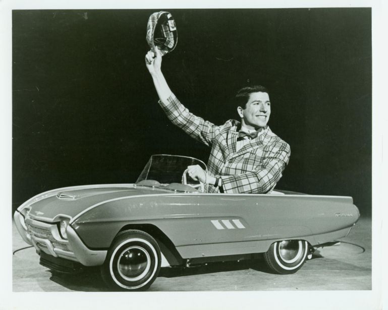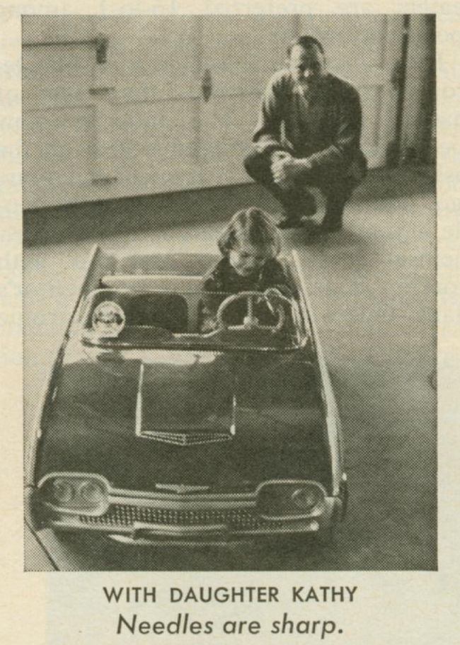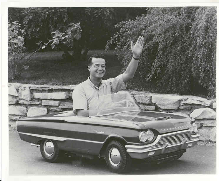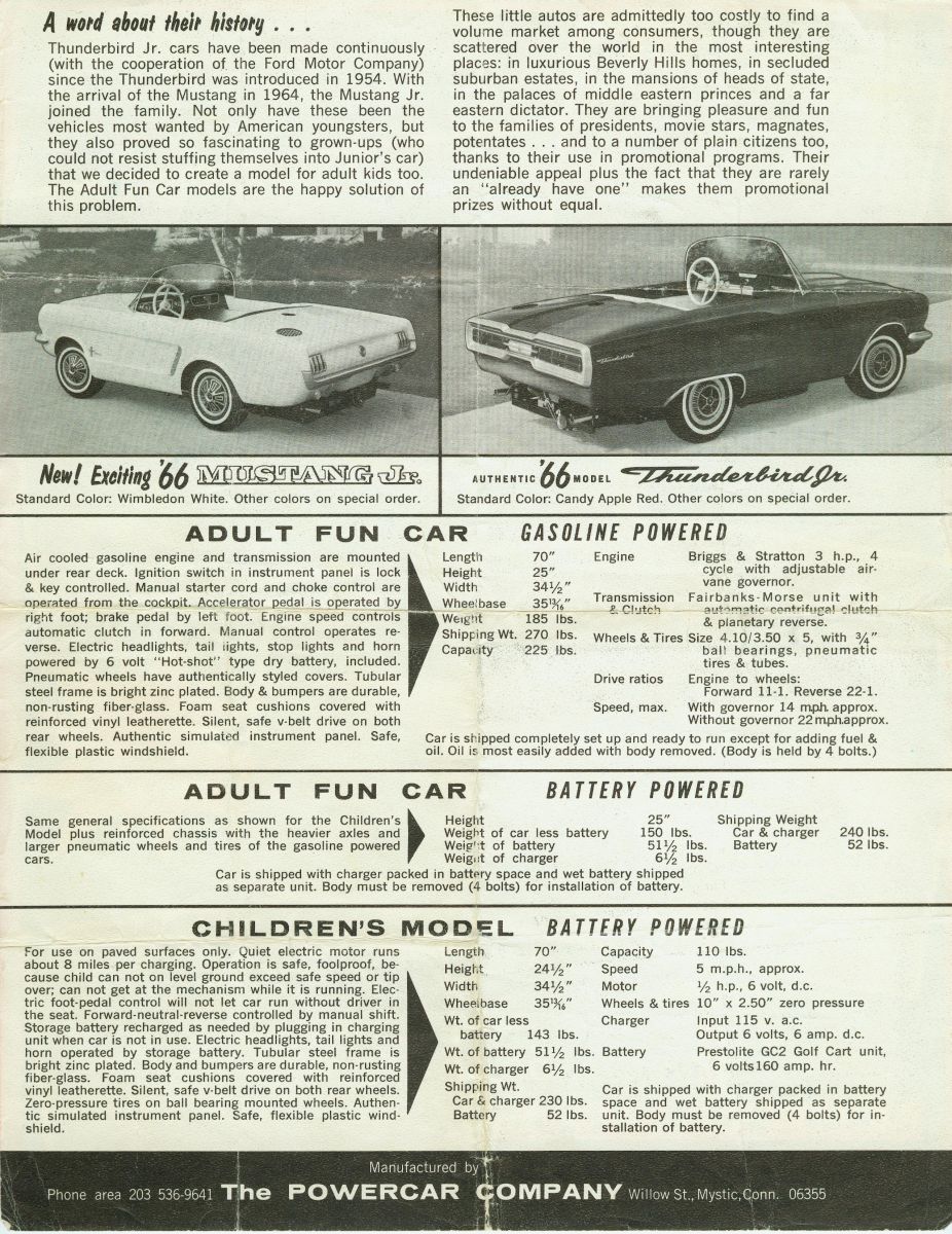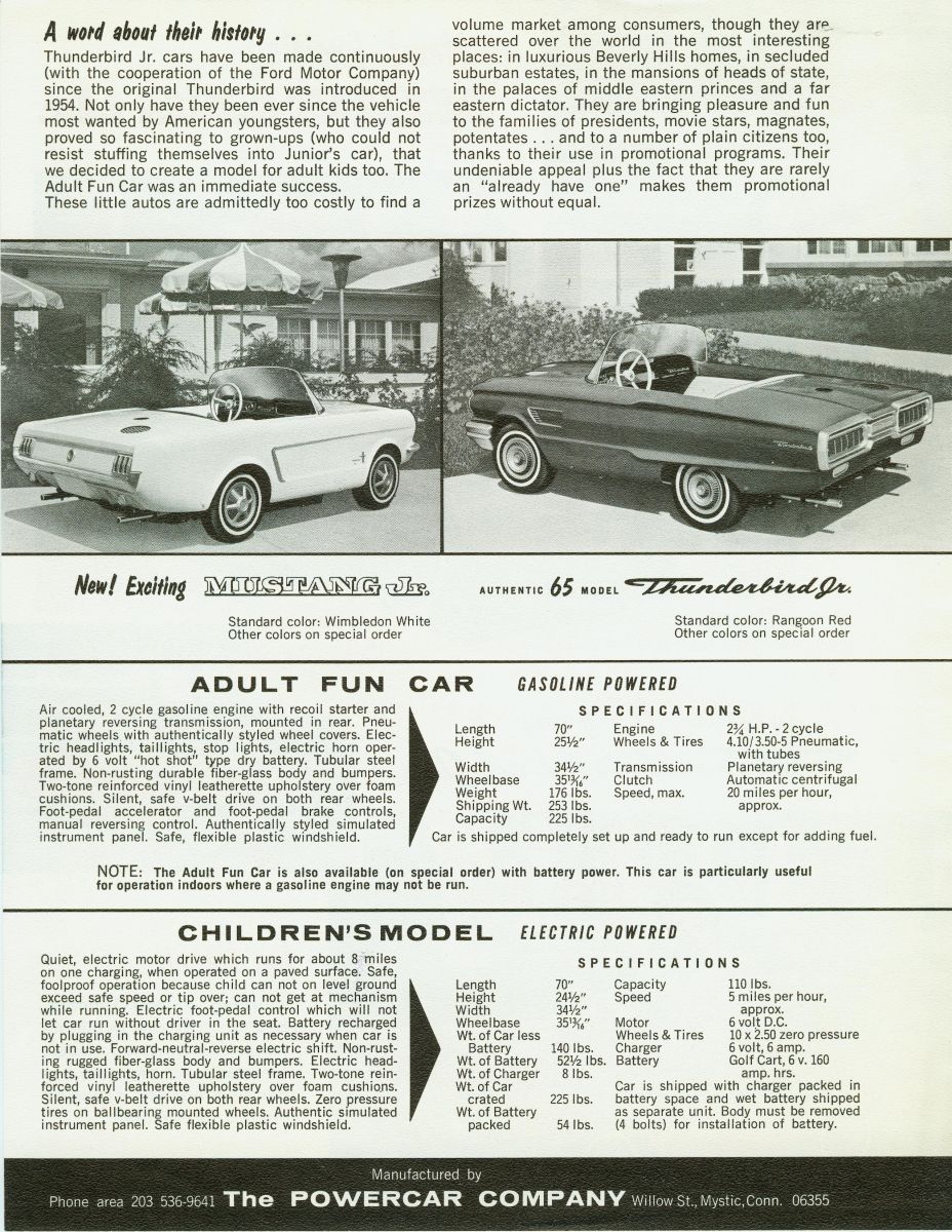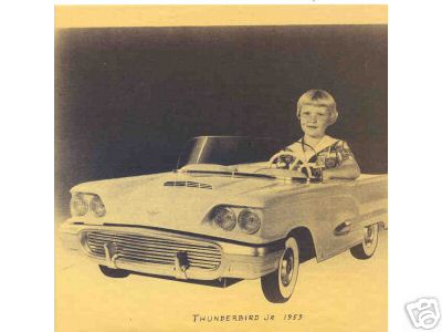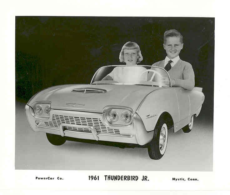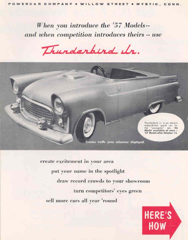 The Powercar company of Mystic Connecticut started making the Thunderbird JR in 1955 and continued through 1967 but stopped updating the body changes in 1966. According to the interview done with George Ford in 1990 they were electric powered until 1964 when you could also get a gas powered adult version. I have found factory literature and a Photograph of a gas powered 1957 Thunderbird JR. so George may have been a little off when he made that statement 23 years after the company went out of business. Not a cheap toy!Here are some of the costs that I know of. 1957 retail price $465.00 Electric ($565.00 Gas model) dealer cost $325.00 1960 1/4 scale $395.00 retail 1965 kids retail $495.00 dealer cost $364.00 1965 adult retail $537.00 dealer cost $395.00 different sizes availablewhile the most known size of Powercar Thunderbird was a 1/3 scale rendition they also made a 1/4 scale in some years. I have seen pictures of a 1956 version that was a pedal car instead of battery powered. I have also found information and images on 1958-60 1/4 scale cars that were made as a less expensive offering by the company. A 1960 Plymouth Fury JR was also made in 1/4 scale but it is the only other example of that scale that I have been able to find anything on thus far. The demensions for the 1960 1/4 scale were as follows I would imagine the 58-59 were the same size 51 1/2" long, 17" tall, 24 3/4" wide, and weight without battery was 80 pounds. I would imagine that one of their best customers would have been the Shriners but most of the information I have been finding is they were used in a lot of other promotions. They were given away in drawings at Ford dealerships Coca-Cola, Pepsi and tide and even at Laundromats and dairies. In 1960 Turkish taffy offered the winner of their jingle contest choice of a 1960 Thunderbird or Plymouth Fury JR. They advertised the competition in "Atomic Mouse" cartoons. Lee Iacocca's daughter is pictured in a 1963 Thunderbird JR in a 1964 issue of time magazine. They were also available through the F.A.O. Swartz catalog. The statement they used on the brochures says it best! "Thunderbird Jr. cars have been made continuously since 1954 (with the cooperation of the ford motor company) you will not see a Thunderbird Jr. in every yard...because their cost has kept them out of the volume market...However, if you know where to look, you can find them scattered over the globe in the most interesting places: in secluded country estates, in mansions of heads of state, on the Riviera, in the palaces of dictators, middle eastern and oriental princes. They are bringing pleasure and fun to the families of presidents, movie stars, magnates, potentates... and to a lot of ordinary people too, who have won them in promotional contests or as incentives. In fact, it is thanks to smart sales promotion programs that many other people are enjoying them" end quote from 1964 sales brochure Since I started collecting information on these cars many years ago I have been lucky to talk to a number of Ex-employees of the Powercar company. Anywhere from the son of the secretary that swept up on weekends to the Production manager and his son who worked as a test driver in the early years. I also had the pleasure to talk to George Ford that ran the company back in 1994 before he passed away. More and more information continues to come out of the woodwork about these cars and the Internet has helped to gather additional information.