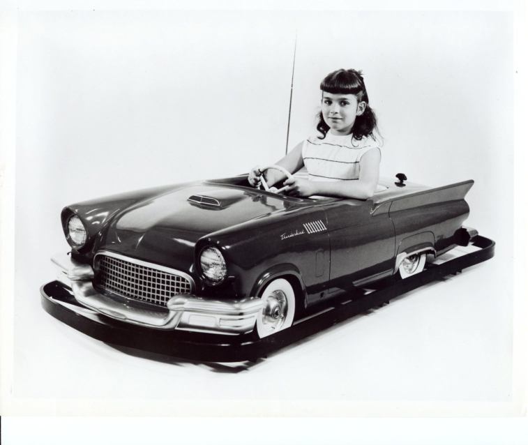 1955 Thunderbird JuniorsThe first year of the Thunderbird and also the first year for the Thunderbird Jr. In 1954 when George Ford of the powercar company read about the new sports car the Ford Motor Company was coming out with he contacted them to see of he could make a mini version of it to sell. Not only did he get permission he also got assistance from Ford styling so that they could have the Mini Birds out the same time as the full size cars so they could be used in introductory festivities. The Baby bird while built to scale of the real cars makes the juniors a small car also. While they were made for kids adults still tried to stuff themselves into one anyway. The body demensions were 60" long (66" with bumpers), 18 3/4" tall, 30" wide, 34 1/2" wheelbase and weight without battery was 143 pounds. |
