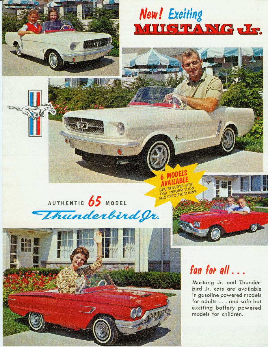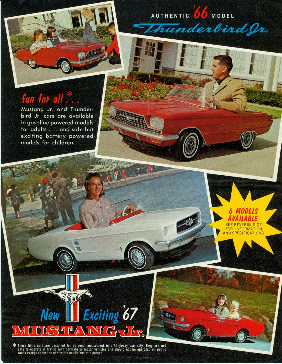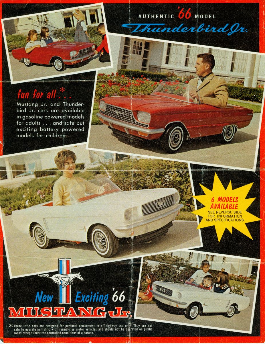 1966 Thunderbird JuniorsThe last of the Thunderbird body styles, even though the company produced Thunderbird JRs in 1967 they did not update the body that year. The 1967 company sales brochure. has an updated 67 Mustang body but they 66 T-Bird body remains the same even though the full size car saw some major changes that year. "Flair birds" see the front of the 66 full line brochure here! see the rear of the 66 full line brochure here! |